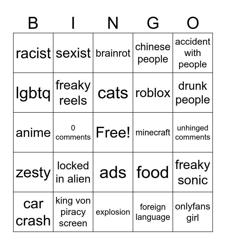 This bingo card has a free space and 24 words: locked in alien, king von piracy screen, cats, car crash, accident with people, racist, lgbtq, sexist, minecraft, ads, roblox, anime, food, freaky sonic, freaky reels, foreign language, unhinged comments, brainrot, drunk people, 0 comments, onlyfans girl, zesty, chinese people and explosion.