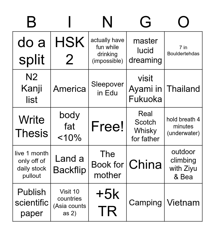 This bingo card has a free space and 24 words: Land a Backflip, Visit 10 countries (Asia counts as 2), Sleepover in Edu, Publish scientific paper, 7 in Bouldertehdas, do a split, N2 Kanji list, HSK 2, Real Scotch Whisky for father, The Book for mother, visit Ayami in Fukuoka, Write Thesis, China, outdoor climbing with Ziyu & Bea, America, Camping, hold breath 4 minutes (underwater), actually have fun while drinking (impossible), Thailand, body fat <10%, Vietnam, live 1 month only off of daily stock pullout, master lucid dreaming and +5k TR.