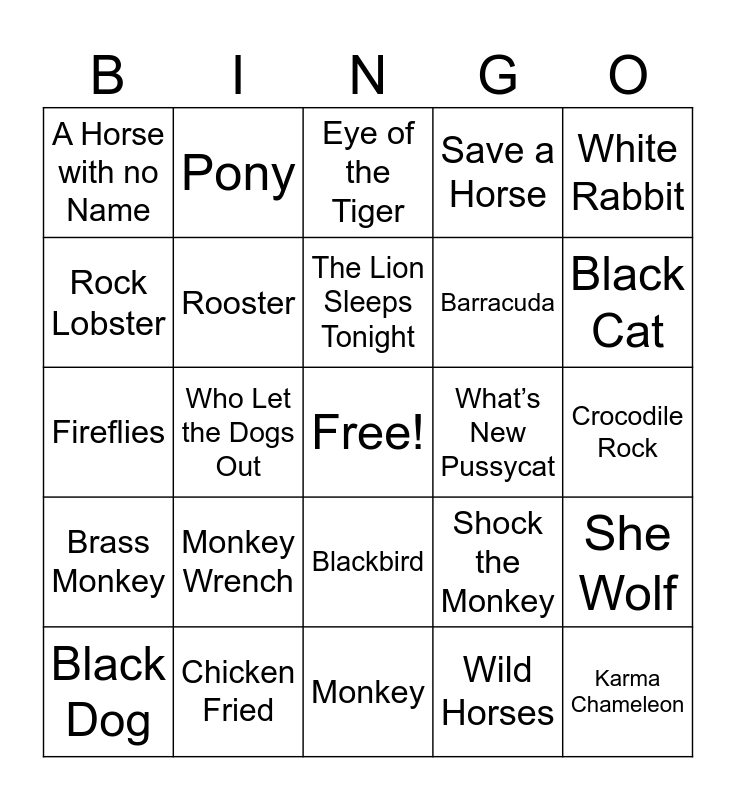 This bingo card has a free space and 47 words: I Am the Walrus, Karma Chameleon, Let Me Be Your Teddy Bear, Monkey, Monkey Wrench, Muskrat Love, Pony, Puppy Love, Rock Lobster, Rocky Raccoon, Rooster, Save a Horse, She Wolf, Shock the Monkey, Spiders & Snakes, The Chipmunk Song, The Lion Sleeps Tonight, What’s New Pussycat, When Doves Cry, White Rabbit, Who Let the Dogs Out, Wild Horses, A Horse with no Name, Barracuda, Bird Dog, Black Cat, Black Dog, Black Horse & the Cherry Tree, Blackbird, Brass Monkey, Buffalo Soldier, Buffalo Stance, Butterfly, Cat Scratch Fever, Cat’s in the Cradle, Chicken Fried, Crocodile Rock, Dark Horse, Disco Duck, Dog & Butterfly, Dog Days are Over, Eye of the Tiger, Fireflies, Fox on the Run, Freebird, Hair of the dog and Hungry Like the Wolf.