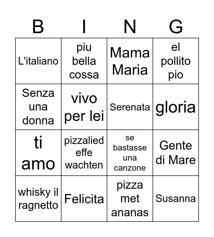 This bingo card has 16 words: Felicita, Gente di Mare, Mama Maria, L'italiano, ti amo, piu bella cossa, se bastasse una canzone, pizza met ananas, Senza una donna, vivo per lei, whisky il ragnetto, el pollito pio, pizzalied effe wachten, gloria, Serenata and Susanna.