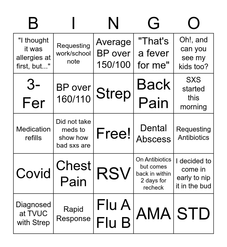 This bingo card has a free space and 24 words: Chest Pain, Rapid Response, Strep, Diagnosed at TVUC with Strep, Oh!, and can you see my kids too?, "I thought it was allergies at first, but...", 3-Fer, Requesting work/school note, Dental Abscess, RSV, Back Pain, Medication refills, On Antibiotics but comes back in within 2 days for recheck, I decided to come in early to nip it in the bud, BP over 160/110, AMA, Requesting Antibiotics, Average BP over 150/100, SXS started this morning, Did not take meds to show how bad sxs are, STD, Covid, "That's a fever for me" and Flu A Flu B.