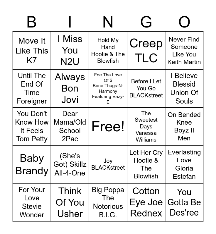 This bingo card has a free space and 24 words: (She's Got) Skillz All-4-One, Think Of You Usher, Foe Tha Love Of $ Bone Thugs-N-Harmony Featuring Eazy-E, For Your Love Stevie Wonder, Never Find Someone Like You Keith Martin, Move It Like This K7, Until The End Of Time Foreigner, I Miss You N2U, The Sweetest Days Vanessa Williams, Joy BLACKstreet, Before I Let You Go BLACKstreet, You Don't Know How It Feels Tom Petty, Let Her Cry Hootie & The Blowfish, Everlasting Love Gloria Estefan, Always Bon Jovi, Cotton Eye Joe Rednex, On Bended Knee Boyz II Men, Hold My Hand Hootie & The Blowfish, I Believe Blessid Union Of Souls, Dear Mama/Old School 2Pac, You Gotta Be Des'ree, Baby Brandy, Creep TLC and Big Poppa The Notorious B.I.G..