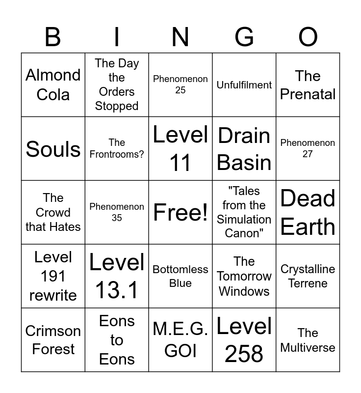 This bingo card has a free space and 24 words: Level 13.1, Eons to Eons, Level 11, Crimson Forest, The Prenatal, Almond Cola, Souls, The Day the Orders Stopped, "Tales from the Simulation Canon", Bottomless Blue, Drain Basin, The Crowd that Hates, The Tomorrow Windows, Crystalline Terrene, The Frontrooms?, Level 258, Dead Earth, Phenomenon 25, Phenomenon 27, Phenomenon 35, The Multiverse, Level 191 rewrite, Unfulfilment and M.E.G. GOI.