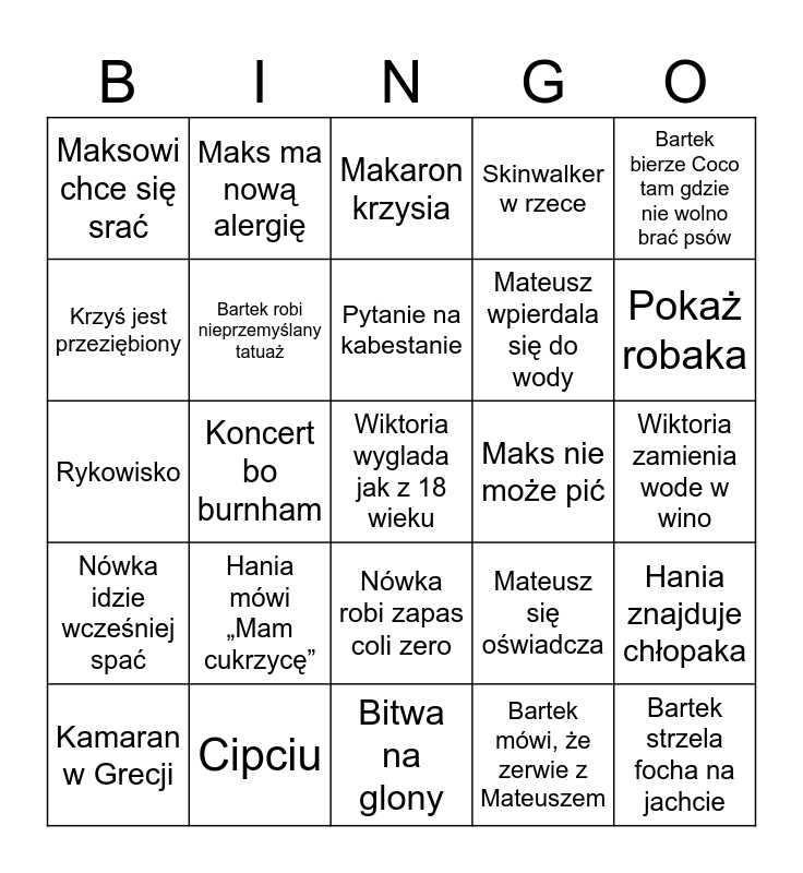 This bingo card has a free space and 24 words: Hania mówi „Mam cukrzycę”, Cipciu, Pytanie na kabestanie, Kamaran w Grecji, Bartek bierze Coco tam gdzie nie wolno brać psów, Maksowi chce się srać, Krzyś jest przeziębiony, Maks ma nową alergię, Maks nie może pić, Nówka robi zapas coli zero, Mateusz wpierdala się do wody, Rykowisko, Mateusz się oświadcza, Hania znajduje chłopaka, Bartek robi nieprzemyślany tatuaż, Bartek mówi, że zerwie z Mateuszem, Wiktoria zamienia wode w wino, Makaron krzysia, Pokaż robaka, Koncert bo burnham, Bartek strzela focha na jachcie, Nówka idzie wcześniej spać, Skinwalker w rzece and Bitwa na glony.