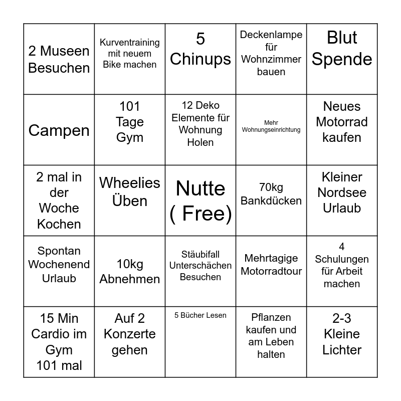 This bingo card has a free space and 24 words: 10kg Abnehmen, Auf 2 Konzerte gehen, 12 Deko Elemente für Wohnung Holen, 15 Min Cardio im Gym 101 mal, Blut Spende, 2 Museen Besuchen, Campen, Kurventraining mit neuem Bike machen, 70kg Bankdücken, Stäubifall Unterschächen Besuchen, Mehr Wohnungseinrichtung, 2 mal in der Woche Kochen, Mehrtagige Motorradtour, 4 Schulungen für Arbeit machen, 101 Tage Gym, Pflanzen kaufen und am Leben halten, Kleiner Nordsee Urlaub, 5 Chinups, Neues Motorrad kaufen, Wheelies Üben, 2-3 Kleine Lichter, Spontan Wochenend Urlaub, Deckenlampe für Wohnzimmer bauen and 5 Bücher Lesen.