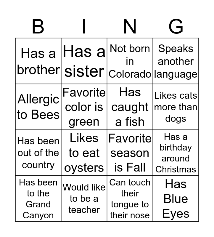 This bingo card has a free space and 15 words: Has been to the Grand Canyon, Has Blue Eyes, Not born in Colorado, Has a brother, Likes cats more than dogs, Allergic to Bees, Likes to eat oysters, Can touch their tongue to their nose, Favorite color is green, Has been out of the country, Has a birthday around Christmas, Speaks another language, Has caught a fish, Has a sister and Would like to be a teacher.