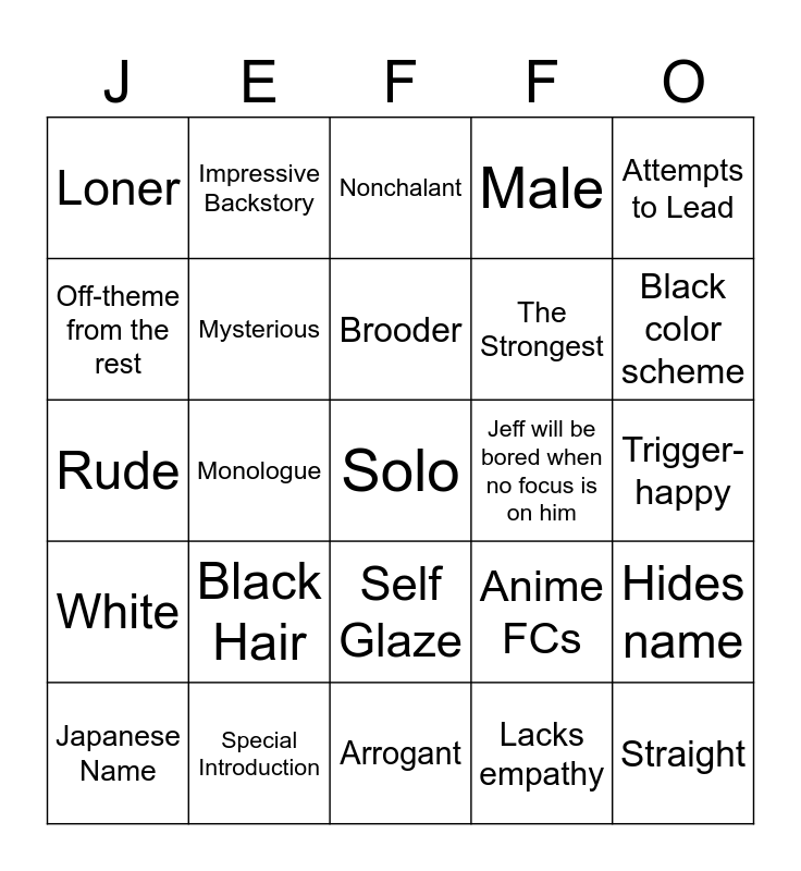 This bingo card has a free space and 24 words: Black Hair, Special Introduction, Brooder, Japanese Name, Attempts to Lead, Loner, Off-theme from the rest, Impressive Backstory, Jeff will be bored when no focus is on him, Self Glaze, The Strongest, Rude, Anime FCs, Hides name, Mysterious, Lacks empathy, Trigger-happy, Nonchalant, Black color scheme, Monologue, Straight, White, Male and Arrogant.