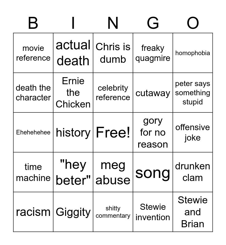 This bingo card has a free space and 24 words: "hey beter", Giggity, celebrity reference, racism, homophobia, movie reference, death the character, actual death, gory for no reason, meg abuse, cutaway, Ehehehehee, song, drunken clam, Ernie the Chicken, Stewie invention, offensive joke, Chris is dumb, peter says something stupid, history, Stewie and Brian, time machine, freaky quagmire and shitty commentary.