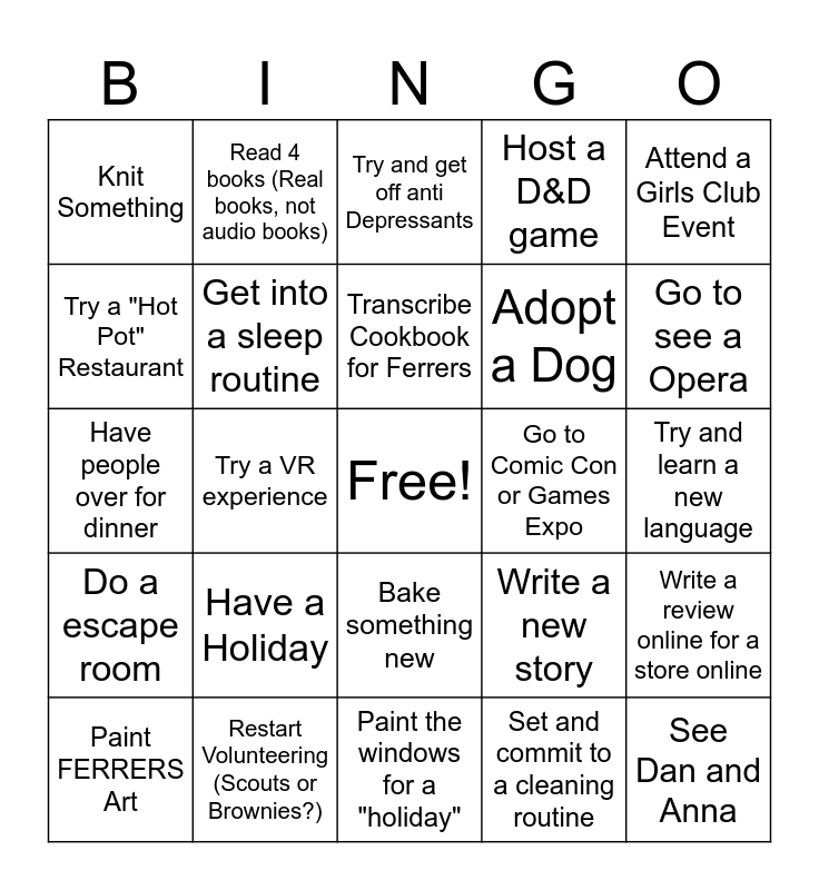 This bingo card has a free space and 24 words: Have a Holiday, Restart Volunteering (Scouts or Brownies?), Transcribe Cookbook for Ferrers, Paint FERRERS Art, Attend a Girls Club Event, Knit Something, Try a "Hot Pot" Restaurant, Read 4 books (Real books, not audio books), Go to Comic Con or Games Expo, Bake something new, Adopt a Dog, Have people over for dinner, Write a new story, Write a review online for a store online, Get into a sleep routine, Set and commit to a cleaning routine, Try and learn a new language, Try and get off anti Depressants, Go to see a Opera, Try a VR experience, See Dan and Anna, Do a escape room, Host a D&D game and Paint the windows for a "holiday".