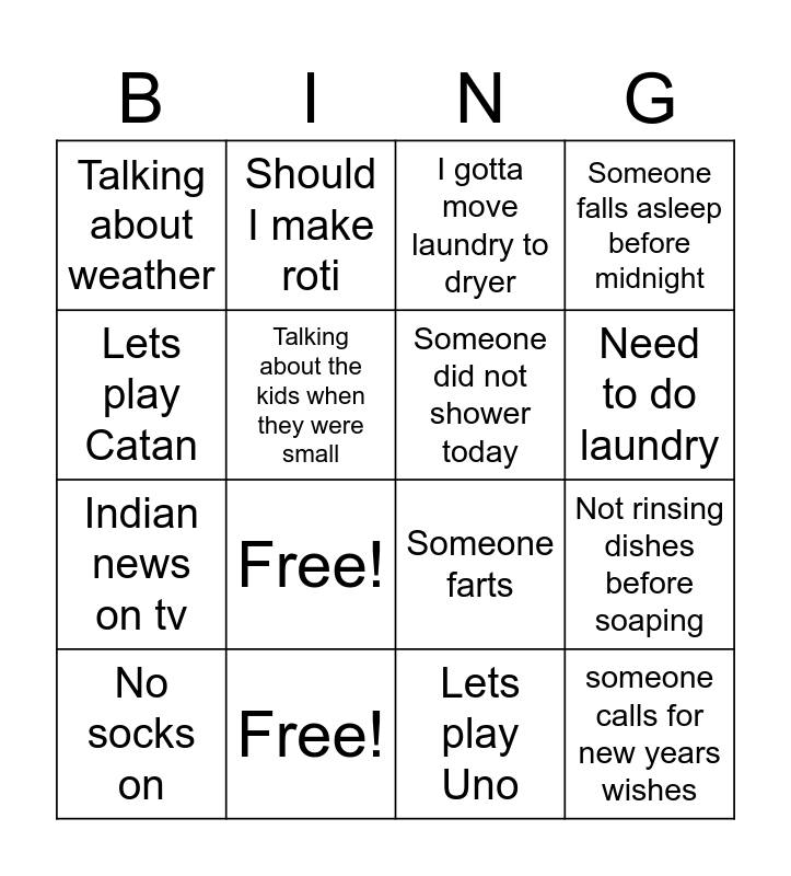 This bingo card has 24 words: Do you want chai?, You can keep doing that, Need to do laundry, Tv is too loud, Lets play Catan, Talking about weather, Talking about the kids when they were small, Should I make roti, Free!, Singing christmas songs, Indian news on tv, Someone farts, Someone not wearing socks, Should I make salad?, Someone did not shower today, Lets play monopoly, Lets play Uno, I gotta move laundry to dryer, Free!, Not rinsing dishes before soaping, No socks on, someone calls for new years wishes, Someone falls asleep before midnight and Nikki starts sweeping.