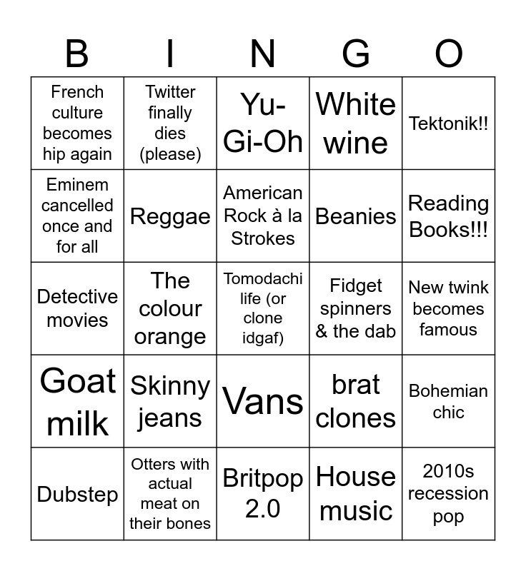 This bingo card has 25 words: Skinny jeans, Britpop 2.0, American Rock à la Strokes, Dubstep, Tektonik!!, French culture becomes hip again, Eminem cancelled once and for all, Twitter finally dies (please), Fidget spinners & the dab, Vans, Beanies, Detective movies, brat clones, Bohemian chic, Reggae, 2010s recession pop, New twink becomes famous, Yu-Gi-Oh, Reading Books!!!, The colour orange, Tomodachi life (or clone idgaf), Otters with actual meat on their bones, Goat milk, White wine and House music.