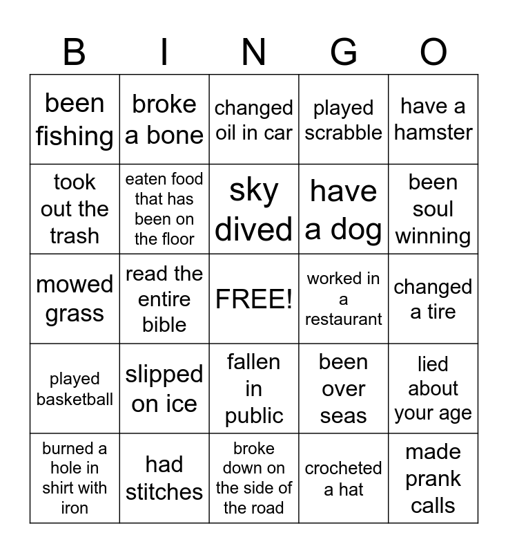 This bingo card has a free space and 24 words: slipped on ice, had stitches, sky dived, burned a hole in shirt with iron, have a hamster, been fishing, took out the trash, broke a bone, worked in a restaurant, fallen in public, have a dog, mowed grass, been over seas, lied about your age, eaten food that has been on the floor, crocheted a hat, changed a tire, changed oil in car, been soul winning, read the entire bible, made prank calls, played basketball, played scrabble and broke down on the side of the road.