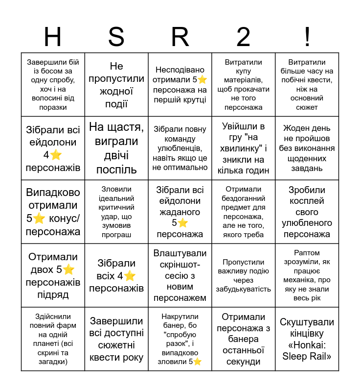 This bingo card has a free space and 24 words: Зібрали всіх 4⭐ персонажів, Завершили всі доступні сюжетні квести року, Зібрали повну команду улюбленців, навіть якщо це не оптимально, Здійснили повний фарм на одній планеті (всі скрині та загадки), Витратили більше часу на побічні квести, ніж на основний сюжет, Завершили бій із босом за одну спробу, хоч і на волосині від поразки, Зібрали всі ейдолони 4⭐ персонажів, Не пропустили жодної події, Отримали бездоганний предмет для персонажа, але не того, якого треба, Влаштували скріншот-сесію з новим персонажем, Увійшли в гру "на хвилинку" і зникли на кілька годин, Випадково отримали 5⭐ конус/персонажа, Пропустили важливу подію через забудькуватість, Раптом зрозуміли, як працює механіка, про яку не знали весь рік, На щастя, виграли двічі поспіль, Отримали персонажа з банера останньої секунди, Зробили косплей свого улюбленого персонажа, Несподівано отримали 5⭐ персонажа на першій крутці, Жоден день не пройшов без виконання щоденних завдань, Зловили ідеальний критичний удар, що зумовив програш, Скуштували кінцівку «Honkai: Sleep Rail», Отримали двох 5⭐ персонажів підряд, Витратили купу матеріалів, щоб прокачати не того персонажа and Накрутили банер, бо "спробую разок", і випадково зловили 5⭐.