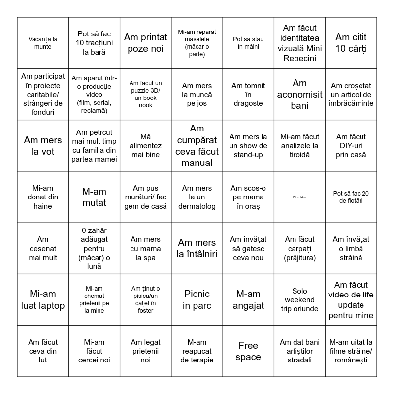 This bingo card has a free space and 48 words: M-am angajat, Am aconomisit bani, M-am reapucat de terapie, M-am mutat, Mă alimentez mai bine, Pot să fac 20 de flotări, Pot să fac 10 tracțiuni la bară, Mi-am făcut cercei noi, Am făcut identitatea vizuală Mini Rebecini, Am mers la întâlniri, Am citit 10 cărți, Mi-am reparat măselele (măcar o parte), Mi-am făcut analizele la tiroidă, Am mers la un show de stand-up, Mi-am luat laptop, First kiss, Am participat în proiecte caritabile/ strângeri de fonduri, Am croșetat un articol de îmbrăcăminte, Solo weekend trip oriunde, Pot să stau în mâini, Am tomnit în dragoste, Am pus murături/ fac gem de casă, Vacanță la munte, Am apărut într-o producție video (film, serial, reclamă), Am făcut video de life update pentru mine, Am făcut un puzzle 3D/ un book nook, Am făcut DIY-uri prin casă, Am făcut ceva din lut, Am cumpărat ceva făcut manual, Am petrcut mai mult timp cu familia din partea mamei, Am dat bani artiștilor stradali, Am scos-o pe mama în oraș, Am învățat o limbă străină, Mi-am chemat prietenii pe la mine, Mi-am donat din haine, Am învățat să gatesc ceva nou, Am făcut carpați (prăjitura), Am mers la vot, Am mers cu mama la spa, Am ținut o pisică/un cățel în foster, Am desenat mai mult, M-am uitat la filme străine/ românești, Am printat poze noi, Am legat prietenii noi, Am mers la muncă pe jos, Picnic in parc, 0 zahăr adăugat pentru (măcar) o lună and Free space.