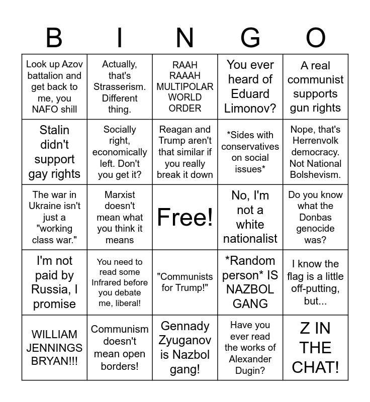 This bingo card has a free space and 24 words: You need to read some Infrared before you debate me, liberal!, Communism doesn't mean open borders!, Reagan and Trump aren't that similar if you really break it down, WILLIAM JENNINGS BRYAN!!!, A real communist supports gun rights, Look up Azov battalion and get back to me, you NAFO shill, Stalin didn't support gay rights, Actually, that's Strasserism. Different thing., No, I'm not a white nationalist, "Communists for Trump!", *Sides with conservatives on social issues*, The war in Ukraine isn't just a "working class war.", *Random person* IS NAZBOL GANG, I know the flag is a little off-putting, but..., Socially right, economically left. Don't you get it?, Have you ever read the works of Alexander Dugin?, Do you know what the Donbas genocide was?, RAAH RAAAH MULTIPOLAR WORLD ORDER, Nope, that's Herrenvolk democracy. Not National Bolshevism., Marxist doesn't mean what you think it means, Z IN THE CHAT!, I'm not paid by Russia, I promise, You ever heard of Eduard Limonov? and Gennady Zyuganov is Nazbol gang!.