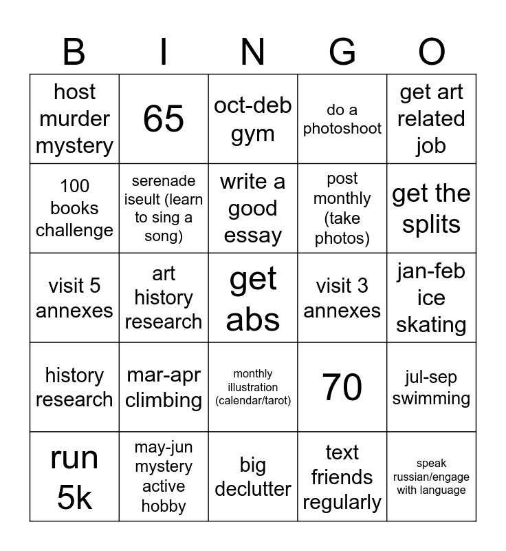 This bingo card has a free space and 24 words: mar-apr climbing, may-jun mystery active hobby, write a good essay, run 5k, get art related job, host murder mystery, 100 books challenge, 65, visit 3 annexes, monthly illustration (calendar/tarot), post monthly (take photos), visit 5 annexes, 70, jul-sep swimming, serenade iseult (learn to sing a song), text friends regularly, jan-feb ice skating, oct-deb gym, get the splits, art history research, speak russian/engage with language, history research, do a photoshoot and big declutter.