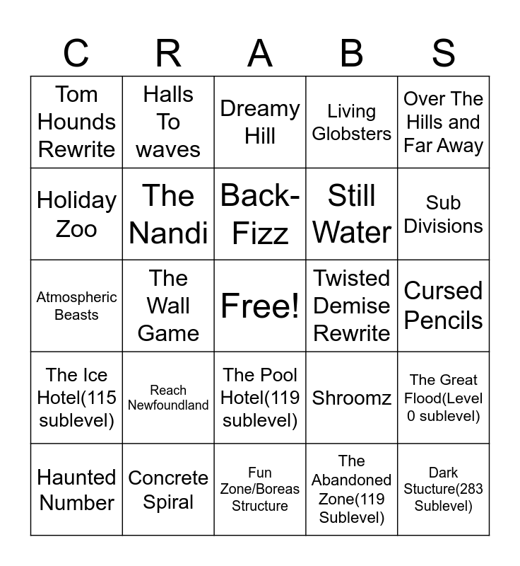 This bingo card has a free space and 24 words: Reach Newfoundland, Concrete Spiral, Back-Fizz, Haunted Number, Over The Hills and Far Away, Tom Hounds Rewrite, Holiday Zoo, Halls To waves, Twisted Demise Rewrite, The Pool Hotel(119 sublevel), Still Water, Atmospheric Beasts, Shroomz, The Great Flood(Level 0 sublevel), The Nandi, The Abandoned Zone(119 Sublevel), Cursed Pencils, Dreamy Hill, Sub Divisions, The Wall Game, Dark Stucture(283 Sublevel), The Ice Hotel(115 sublevel), Living Globsters and Fun Zone/Boreas Structure.