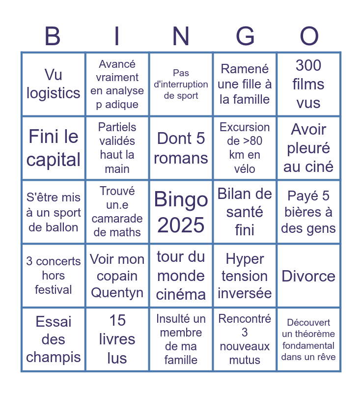 This bingo card has a free space and 24 words: Voir mon copain Quentyn, 15 livres lus, Dont 5 romans, Essai des champis, 300 films vus, Vu logistics, Fini le capital, Avancé vraiment en analyse p adique, Bilan de santé fini, tour du monde cinéma, Excursion de >80 km en vélo, S'être mis à un sport de ballon, Hyper tension inversée, Divorce, Partiels validés haut la main, Rencontré 3 nouveaux mutus, Payé 5 bières à des gens, Pas d'interruption de sport, Avoir pleuré au ciné, Trouvé un.e camarade de maths, Découvert un théorème fondamental dans un rêve, 3 concerts hors festival, Ramené une fille à la famille and Insulté un membre de ma famille.