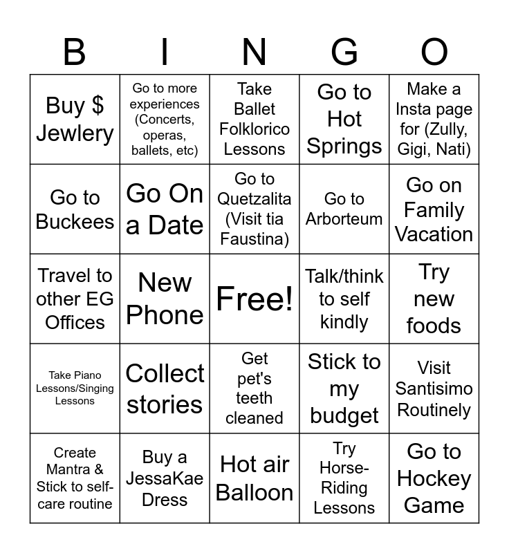 This bingo card has a free space and 34 words: Learn how to Golf, Try Horse-Riding Lessons, Take Sewing Lessons, Find/Buy Fashionable Clothes, Take Piano Lessons/Singing Lessons, Go On a Date, Make a Insta page for (Zully, Gigi, Nati), Create Mantra & Stick to self-care routine, Go to more experiences (Concerts, operas, ballets, etc), Go to the Beach, Go to Quetzalita (Visit tia Faustina), Take Ballet Folklorico Lessons, Go visit Sue + Heri, Smile on Purpose once a day, Talk/think to self kindly, Go on Family Vacation, Buy a JessaKae Dress, Travel to other EG Offices, Collect stories, Stick to my budget, Get pet's teeth cleaned, Go to Tulip Farm, Buy $ Jewlery, Try new foods, Hot air Balloon, Go to Hockey Game, Go to Hot Springs, Shoot a gun/Gun Certification, Go to Arborteum, Go to Buckees, Sky diving, New Phone, Visit Santisimo Routinely and Free Space.