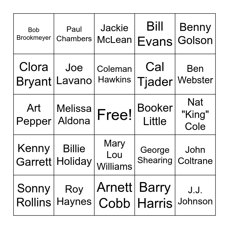 This bingo card has a free space and 42 words: James Spaulding, Coleman Hawkins, Donald Byrd, Billie Holiday, Barry Harris, John Coltrane, J.J. Johnson, Miles Davis, Jackie McLean, Mary Lou Williams, Nat "King" Cole, Ben Webster, Melissa Aldona, Benny Golson, Carmen McCrae, George Shearing, Clifford Brown, Art Pepper, Fats Navarro, Paul Chambers, Clora Bryant, Pete La Roca, Andrew Hill, Bob Brookmeyer, J.R. Monterose, Art Taylor, Cal Tjader, Bobby Hutcherson, Lional Hampton, Kenny Barron, Jeff Ballard, Kenny Garrett, Joe Lavano, Arnett Cobb, Johnny Griffin, Sonny Rollins, Roy Haynes, Booker Little, Philly Joe Jones, Horace Silver, Bill Evans and Junior Mance.