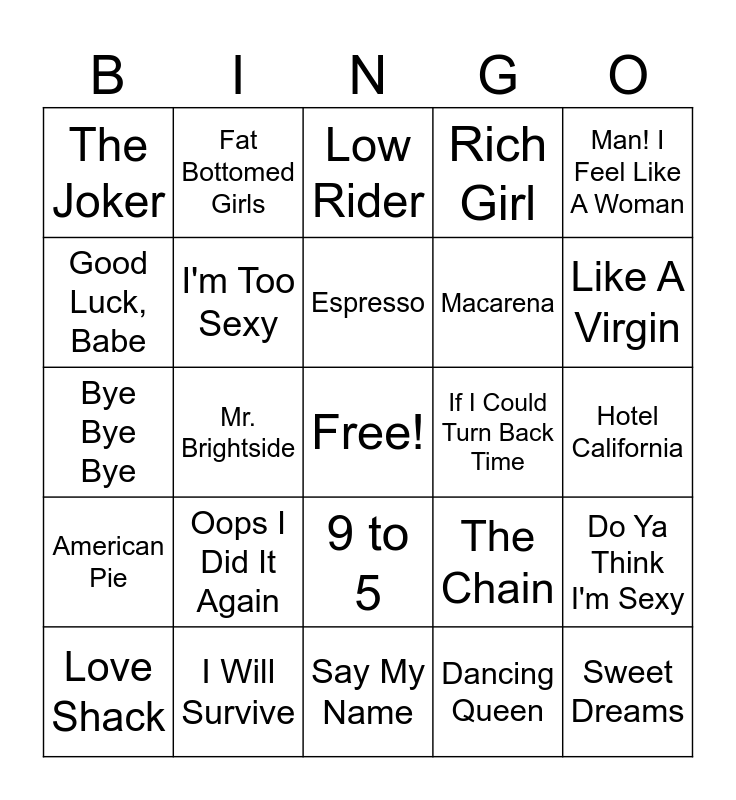This bingo card has a free space and 45 words: YMCA, Sweet Dreams, Push It, Love Shack, Whip It, Dancing Queen, Low Rider, Karma Chameleon, Man! I Feel Like A Woman, I Will Survive, Rich Girl, If I Could Turn Back Time, 9 to 5, Oops I Did It Again, Genie In A Bottle, Say My Name, The Loco Motion, Bye Bye Bye, Take On Me, Like A Virgin, Fat Bottomed Girls, Ice Ice Baby, Lady Marmalade, The Joker, Sweet Home Alabama, Hotel California, Slow Ride, Bennie and the jets, The Chain, American Pie, Message In A Bottle, Do Ya Think I'm Sexy, Gold Digger, Can't Stop, Umbrella, Mr. Brightside, Buddy Holly, Shake It Off, SexyBack, Espresso, Good Luck, Babe, Macarena, Tainted Love, I'm Too Sexy and Blue (Da Ba Dee).