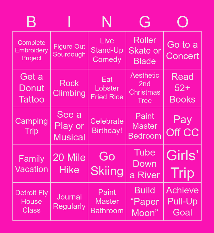This bingo card has a free space and 24 words: 20 Mile Hike, Journal Regularly, Eat Lobster Fried Rice, Detroit Fly House Class, Go to a Concert, Complete Embroidery Project, Get a Donut Tattoo, Figure Out Sourdough, Paint Master Bedroom, Go Skiing, Aesthetic 2nd Christmas Tree, Camping Trip, Tube Down a River, Girls’ Trip, Rock Climbing, Build “Paper Moon”, Pay Off CC, Live Stand-Up Comedy, Read 52+ Books, See a Play or Musical, Achieve Pull-Up Goal, Family Vacation, Roller Skate or Blade and Paint Master Bathroom.