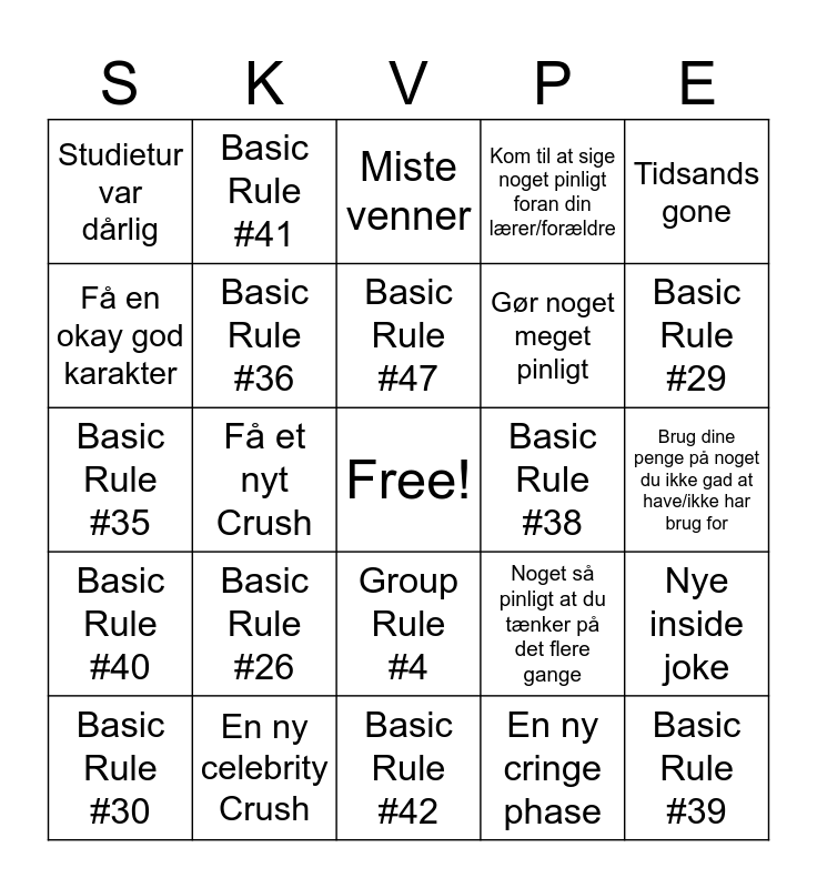 This bingo card has a free space and 57 words: Består alle eksamener, Kysse musse 💋💋💋, Gå på en date (Venlig), Kom til at sige noget pinligt foran din lærer/forældre, Brug dine penge på noget du ikke gad at have/ikke har brug for, For en okay dårlig karakter, Få et nyt Crush, Få nye venner, Gør noget meget pinligt, Få noget meget dyrt, Studietur var dårlig, Gå på en date (Romantisk), Kom til at falde foran en, Nye inside joke, Studietur var god, Være en del af kærlighedsdrama, Miste venner, Noget så pinligt at du tænker på det flere gange, Prøve noget mad du ikke har smagt før, Få en okay god karakter, En ny celebrity Crush, Være sammen med dine venner fem gange i år, En ny cringe phase, Tidsands gone, Basic Rule #25, Basic Rule #26, Basic Rule #27, Basic Rule #28, Basic Rule #29, Basic Rule #30, Basic Rule #31, Basic Rule #32, Basic Rule #33, Basic Rule #34, Basic Rule #35, Basic Rule #36, Basic Rule #37, Basic Rule #38, Basic Rule #39, Basic Rule #40, Basic Rule #41, Basic Rule #42, Basic Rule #43, Basic Rule #44, Basic Rule #45, Basic Rule #46, Basic Rule #47, Basic Rule #48, Group Rule #1, Group Rule #2, Group Rule #3, Group Rule #4, Group Rule #5, Group Rule #6, Group Rule #7, Group Rule #8 and Group Rule #9.