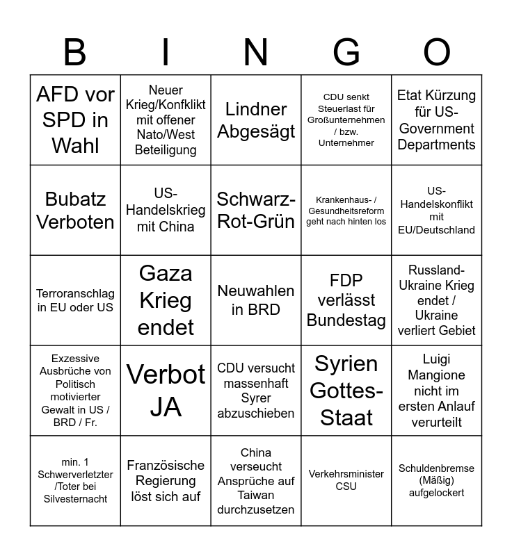 This bingo card has a free space and 24 words: Verbot JA, Französische Regierung löst sich auf, Schwarz-Rot-Grün, min. 1 Schwerverletzter /Toter bei Silvesternacht, Etat Kürzung für US-Government Departments, AFD vor SPD in Wahl, Bubatz Verboten, Neuer Krieg/Konfklikt mit offener Nato/West Beteiligung, FDP verlässt Bundestag, CDU versucht massenhaft Syrer abzuschieben, Krankenhaus- / Gesundheitsreform geht nach hinten los, Terroranschlag in EU oder US, Syrien Gottes-Staat, Luigi Mangione nicht im ersten Anlauf verurteilt, US-Handelskrieg mit China, Verkehrsminister CSU, Russland-Ukraine Krieg endet / Ukraine verliert Gebiet, Lindner Abgesägt, US-Handelskonflikt mit EU/Deutschland, Gaza Krieg endet, Schuldenbremse (Mäßig) aufgelockert, Exzessive Ausbrüche von Politisch motivierter Gewalt in US / BRD / Fr., CDU senkt Steuerlast für Großunternehmen / bzw. Unternehmer and China verseucht Ansprüche auf Taiwan durchzusetzen.