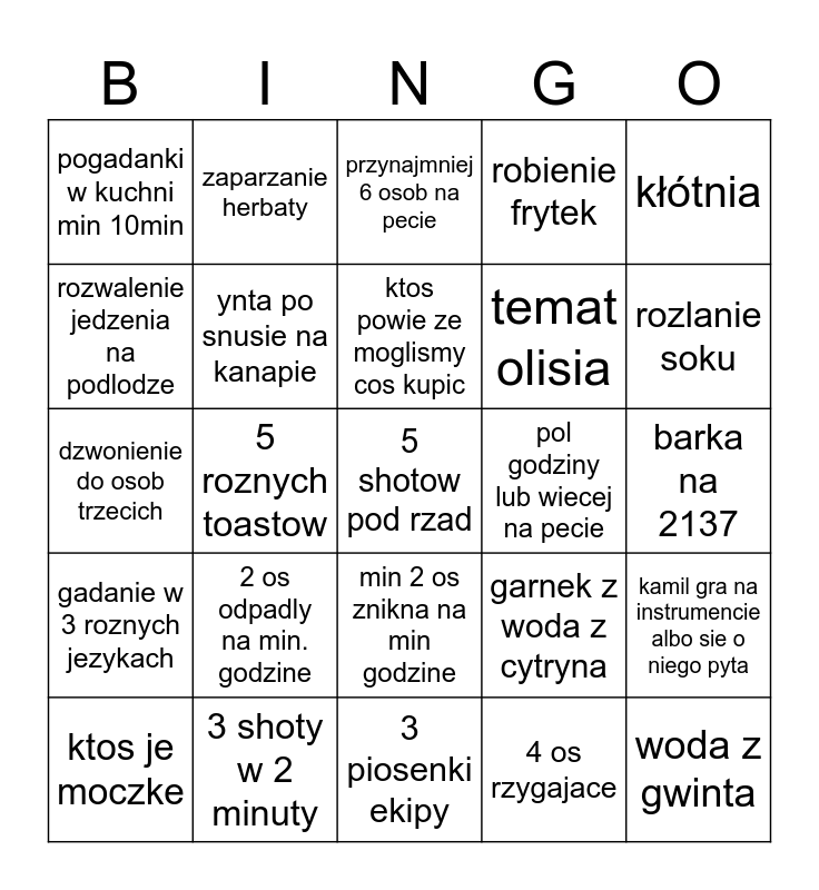 This bingo card has a free space and 24 words: 2 os odpadly na min. godzine, 3 shoty w 2 minuty, ktos powie ze moglismy cos kupic, ktos je moczke, kłótnia, pogadanki w kuchni min 10min, rozwalenie jedzenia na podlodze, zaparzanie herbaty, pol godziny lub wiecej na pecie, min 2 os znikna na min godzine, temat olisia, dzwonienie do osob trzecich, garnek z woda z cytryna, kamil gra na instrumencie albo sie o niego pyta, ynta po snusie na kanapie, 4 os rzygajace, barka na 2137, przynajmniej 6 osob na pecie, rozlanie soku, 5 roznych toastow, woda z gwinta, gadanie w 3 roznych jezykach, robienie frytek and 3 piosenki ekipy.