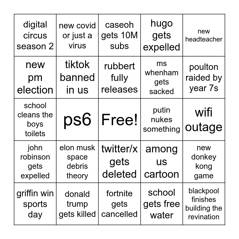This bingo card has a free space and 24 words: elon musk space debris theory, donald trump gets killed, rubbert fully releases, griffin win sports day, new headteacher, digital circus season 2, new pm election, new covid or just a virus, putin nukes something, twitter/x gets deleted, ms whenham gets sacked, school cleans the boys toilets, among us cartoon, new donkey kong game, tiktok banned in us, school gets free water, wifi outage, caseoh gets 10M subs, poulton raided by year 7s, ps6, blackpool finishes building the revination, john robinson gets expelled, hugo gets expelled and fortnite gets cancelled.