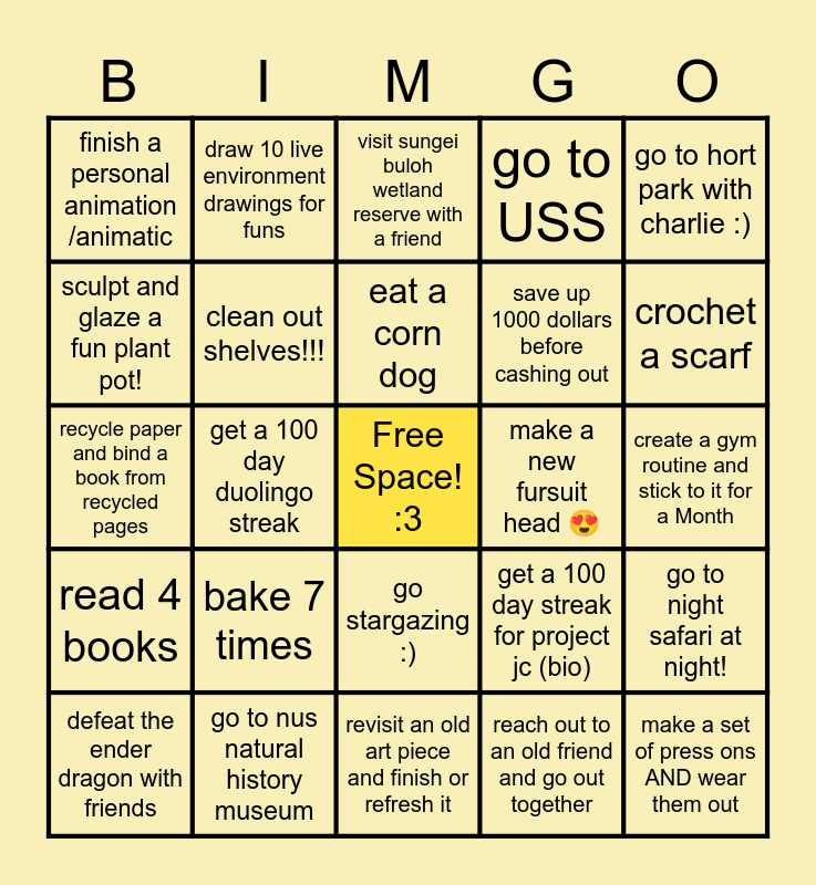 This bingo card has a free space and 24 words: bake 7 times, go to nus natural history museum, eat a corn dog, defeat the ender dragon with friends, go to hort park with charlie :), finish a personal animation /animatic, sculpt and glaze a fun plant pot!, draw 10 live environment drawings for funs, make a new fursuit head 😍, go stargazing :), save up 1000 dollars before cashing out, recycle paper and bind a book from recycled pages, get a 100 day streak for project jc (bio), go to night safari at night!, clean out shelves!!!, reach out to an old friend and go out together, create a gym routine and stick to it for a Month, visit sungei buloh wetland reserve with a friend, crochet a scarf, get a 100 day duolingo streak, make a set of press ons AND wear them out, read 4 books, go to USS and revisit an old art piece and finish or refresh it.