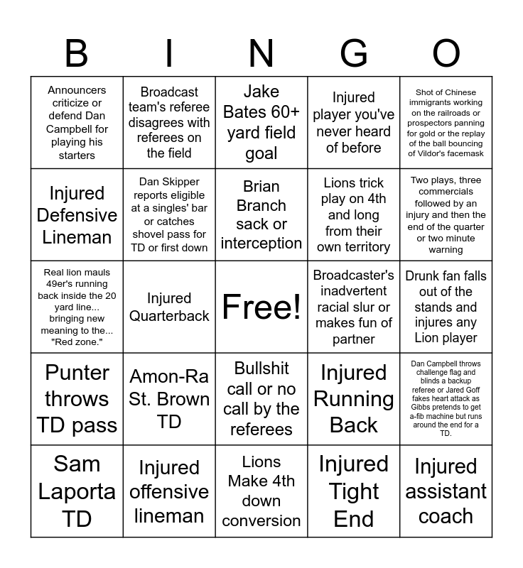 This bingo card has a free space and 24 words: Amon-Ra St. Brown TD, Injured offensive lineman, Brian Branch sack or interception, Sam Laporta TD, Shot of Chinese immigrants working on the railroads or prospectors panning for gold or the replay of the ball bouncing of Vildor's facemask, Announcers criticize or defend Dan Campbell for playing his starters, Injured Defensive Lineman, Broadcast team's referee disagrees with referees on the field, Broadcaster's inadvertent racial slur or makes fun of partner, Bullshit call or no call by the referees, Lions trick play on 4th and long from their own territory, Real lion mauls 49er's running back inside the 20 yard line... bringing new meaning to the... "Red zone.", Injured Running Back, Dan Campbell throws challenge flag and blinds a backup referee or Jared Goff fakes heart attack as Gibbs pretends to get a-fib machine but runs around the end for a TD., Dan Skipper reports eligible at a singles' bar or catches shovel pass for TD or first down, Injured Tight End, Drunk fan falls out of the stands and injures any Lion player, Jake Bates 60+ yard field goal, Two plays, three commercials followed by an injury and then the end of the quarter or two minute warning, Injured Quarterback, Injured assistant coach, Punter throws TD pass, Injured player you've never heard of before and Lions Make 4th down conversion.
