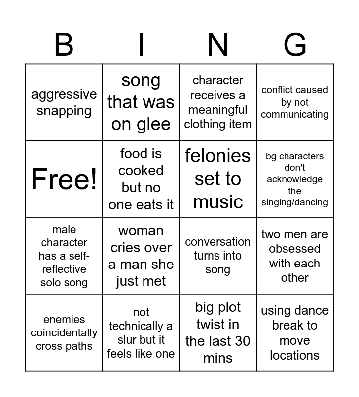 This bingo card has 16 words: not technically a slur but it feels like one, two men are obsessed with each other, character receives a meaningful clothing item, aggressive snapping, male character has a self-reflective solo song, song that was on glee, conversation turns into song, big plot twist in the last 30 mins, Free!, food is cooked but no one eats it, enemies coincidentally cross paths, conflict caused by not communicating, woman cries over a man she just met, bg characters don't acknowledge the singing/dancing, felonies set to music and using dance break to move locations.