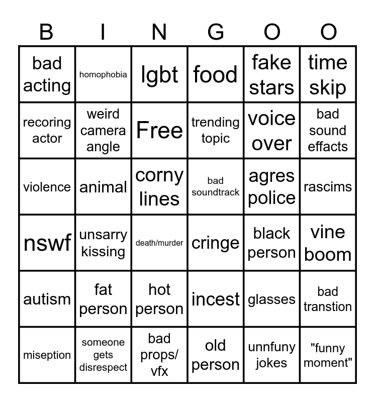 This bingo card has 36 words: nswf, unsarry kissing, bad props/ vfx, trending topic, agres police, rascims, bad acting, someone gets disrespect, lgbt, incest, voice over, time skip, autism, animal, Free, food, glasses, vine boom, recoring actor, weird camera angle, death/murder, cringe, black person, bad transtion, violence, homophobia, corny lines, old person, fake stars, bad sound effacts, miseption, fat person, hot person, bad soundtrack, unnfuny jokes and "funny moment".