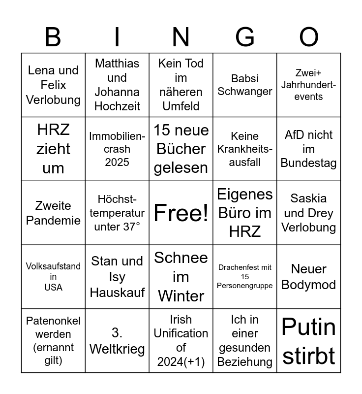 This bingo card has a free space and 24 words: Stan und Isy Hauskauf, 3. Weltkrieg, 15 neue Bücher gelesen, Patenonkel werden (ernannt gilt), Zwei+ Jahrhundert- events, Lena und Felix Verlobung, HRZ zieht um, Matthias und Johanna Hochzeit, Eigenes Büro im HRZ, Schnee im Winter, Keine Krankheits-ausfall, Zweite Pandemie, Drachenfest mit 15 Personengruppe, Neuer Bodymod, Immobilien- crash 2025, Ich in einer gesunden Beziehung, Saskia und Drey Verlobung, Kein Tod im näheren Umfeld, AfD nicht im Bundestag, Höchst- temperatur unter 37°, Putin stirbt, Volksaufstand in USA, Babsi Schwanger and Irish Unification of 2024(+1).
