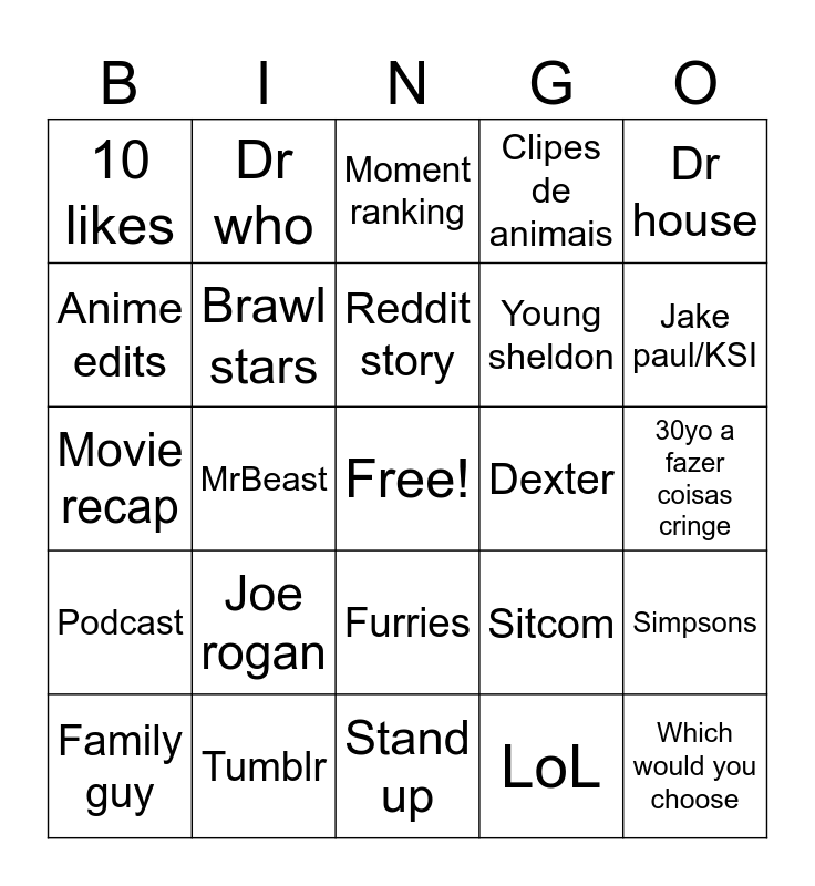 This bingo card has a free space and 24 words: Joe rogan, Tumblr, Reddit story, Family guy, Dr house, 10 likes, Anime edits, Dr who, Dexter, Furries, Young sheldon, Movie recap, Sitcom, Simpsons, Brawl stars, LoL, 30yo a fazer coisas cringe, Moment ranking, Jake paul/KSI, MrBeast, Which would you choose, Podcast, Clipes de animais and Stand up.
