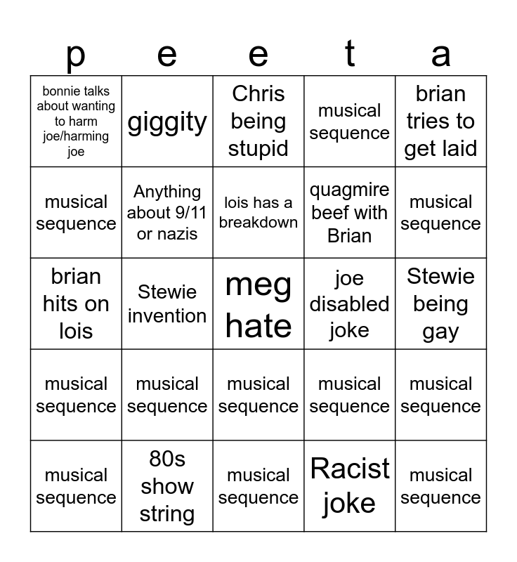 This bingo card has 50 words: Action scene, 80s show string, reference, cut away, Stewie being gay, Live action joke, giggity, who else but quagmire, quagmire beef with Brian, Dirty joke, bonnie talks about wanting to harm joe/harming joe, Anything about 9/11 or nazis, meg hate, Racist joke, Sexist/political joke, peter laugh, Stewie invention, lois has a breakdown, peter v lois' parents, brian tries to get laid, brian hits on lois, Stupid wholesome moment, Chris being stupid, joe disabled joke, family guy death pose, musical sequence, musical sequence, musical sequence, musical sequence, musical sequence, musical sequence, musical sequence, musical sequence, musical sequence, musical sequence, musical sequence, musical sequence, musical sequence, musical sequence, musical sequence, musical sequence, musical sequence, musical sequence, musical sequence, musical sequence, musical sequence, musical sequence, musical sequence, musical sequence and musical sequence.