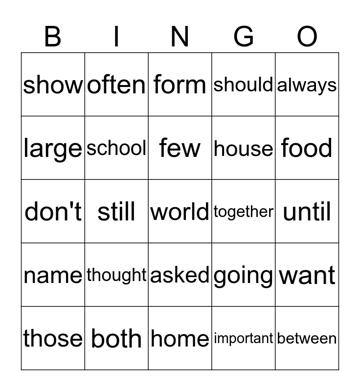 This bingo card has a free space and 24 words: thought, both, few, those, always, show, large, often, together, asked, house, don't, going, want, school, important, until, form, food, still, between, name, should and home.