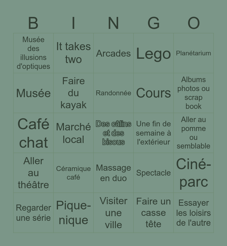 This bingo card has a free space and 24 words: Céramique café, Pique- nique, Randonnée, Regarder une série, Planétarium, Musée des illusions d'optiques, Musée, It takes two, Une fin de semaine à l'extérieur, Massage en duo, Cours, Café chat, Spectacle, Ciné-parc, Faire du kayak, Faire un casse tête, Aller au pomme ou semblable, Arcades, Albums photos ou scrap book, Marché local, Essayer les loisirs de l'autre, Aller au théâtre, Lego and Visiter une ville.