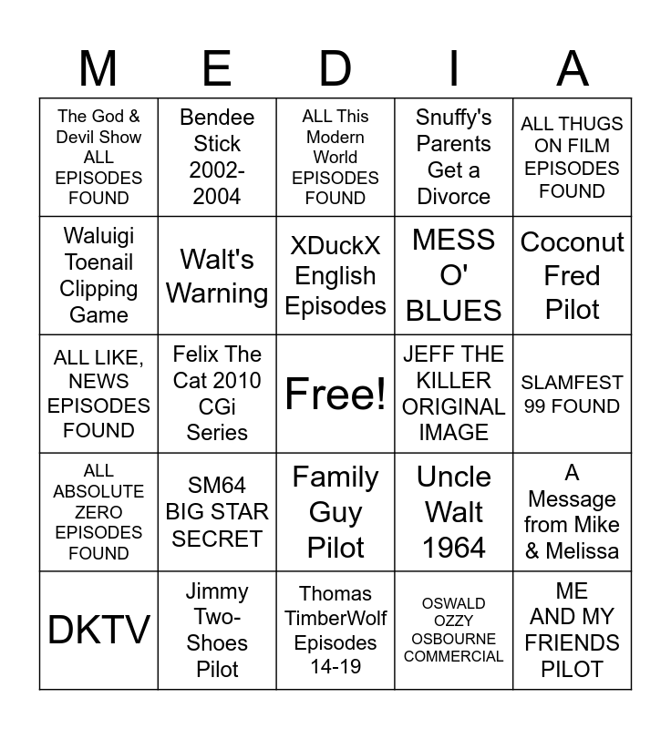 This bingo card has a free space and 24 words: SM64 BIG STAR SECRET, Jimmy Two-Shoes Pilot, XDuckX English Episodes, DKTV, ALL THUGS ON FILM EPISODES FOUND, The God & Devil Show ALL EPISODES FOUND, Waluigi Toenail Clipping Game, Bendee Stick 2002-2004, JEFF THE KILLER ORIGINAL IMAGE, Family Guy Pilot, MESS O' BLUES, ALL LIKE, NEWS EPISODES FOUND, Uncle Walt 1964, A Message from Mike & Melissa, Walt's Warning, OSWALD OZZY OSBOURNE COMMERCIAL, SLAMFEST 99 FOUND, ALL This Modern World EPISODES FOUND, Coconut Fred Pilot, Felix The Cat 2010 CGi Series, ME AND MY FRIENDS PILOT, ALL ABSOLUTE ZERO EPISODES FOUND, Snuffy's Parents Get a Divorce and Thomas TimberWolf Episodes 14-19.