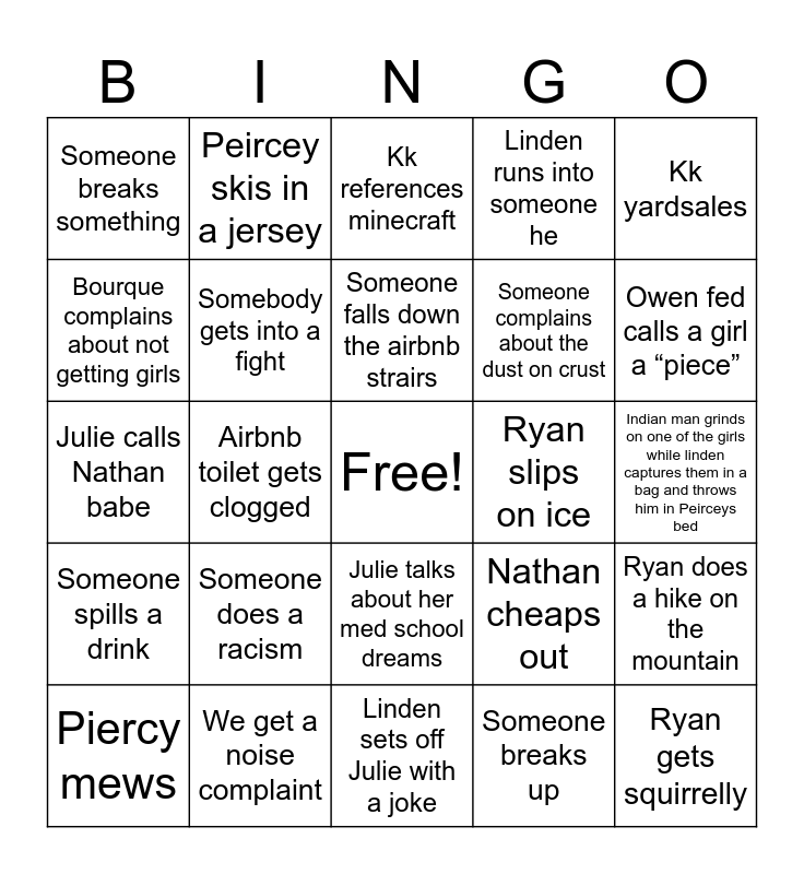 This bingo card has a free space and 24 words: Someone does a racism, We get a noise complaint, Someone falls down the airbnb strairs, Piercy mews, Kk yardsales, Someone breaks something, Bourque complains about not getting girls, Peircey skis in a jersey, Ryan slips on ice, Julie talks about her med school dreams, Someone complains about the dust on crust, Julie calls Nathan babe, Nathan cheaps out, Ryan does a hike on the mountain, Somebody gets into a fight, Someone breaks up, Indian man grinds on one of the girls while linden captures them in a bag and throws him in Peirceys bed, Kk references minecraft, Owen fed calls a girl a “piece”, Airbnb toilet gets clogged, Ryan gets squirrelly, Someone spills a drink, Linden runs into someone he and Linden sets off Julie with a joke.