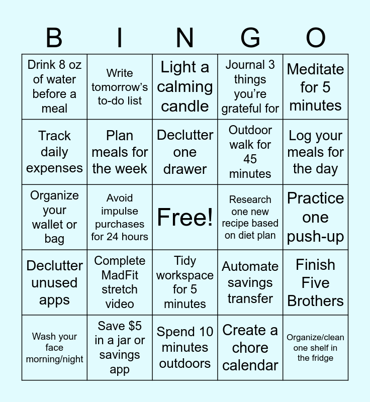 This bingo card has a free space and 24 words: Complete MadFit stretch video, Save $5 in a jar or savings app, Declutter one drawer, Wash your face morning/night, Meditate for 5 minutes, Drink 8 oz of water before a meal, Track daily expenses, Write tomorrow’s to-do list, Research one new recipe based on diet plan, Tidy workspace for 5 minutes, Outdoor walk for 45 minutes, Organize your wallet or bag, Automate savings transfer, Finish Five Brothers, Plan meals for the week, Create a chore calendar, Practice one push-up, Light a calming candle, Log your meals for the day, Avoid impulse purchases for 24 hours, Organize/clean one shelf in the fridge, Declutter unused apps, Journal 3 things you’re grateful for and Spend 10 minutes outdoors.