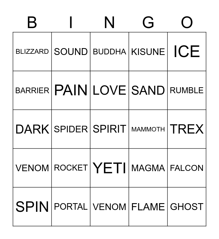 This bingo card has a free space and 24 words: ROCKET, PORTAL, LOVE, SPIN, ICE, BLIZZARD, BARRIER, SOUND, MAMMOTH, YETI, SAND, DARK, MAGMA, FALCON, PAIN, FLAME, TREX, BUDDHA, RUMBLE, SPIDER, GHOST, VENOM, KISUNE and VENOM.