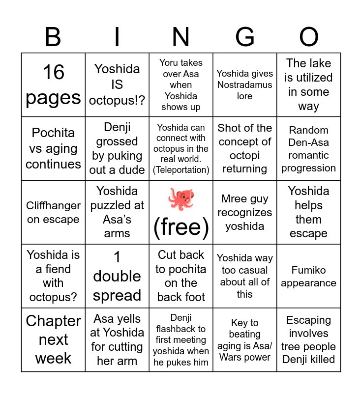 This bingo card has a free space and 24 words: 1 double spread, Asa yells at Yoshida for cutting her arm, Yoshida can connect with octopus in the real world. (Teleportation), Chapter next week, The lake is utilized in some way, 16 pages, Pochita vs aging continues, Yoshida IS octopus!?, Mree guy recognizes yoshida, Cut back to pochita on the back foot, Shot of the concept of octopi returning, Cliffhanger on escape, Yoshida way too casual about all of this, Fumiko appearance, Denji grossed by puking out a dude, Key to beating aging is Asa/ Wars power, Yoshida helps them escape, Yoru takes over Asa when Yoshida shows up, Random Den-Asa romantic progression, Yoshida puzzled at Asa’s arms, Escaping involves tree people Denji killed, Yoshida is a fiend with octopus?, Yoshida gives Nostradamus lore and Denji flashback to first meeting yoshida when he pukes him.