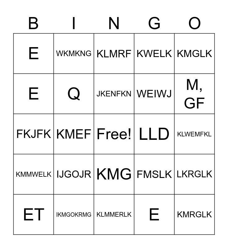 This bingo card has a free space and 24 words: IJGOJR, IKMGOKRMG, JKENFKN, ET, KMGLK, E, E, WKMKNG, LLD, KMG, WEIWJ, FKJFK, FMSLK, LKRGLK, Q, E, KLWEMFKL, KLMRF, M, GF, KMEF, KMRGLK, KMMWELK, KWELK and KLMMERLK.