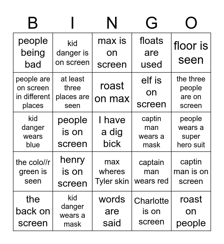 This bingo card has a free space and 24 words: henry is on screen, kid danger wears a mask, roast on max, the back on screen, floor is seen, people being bad, people are on screen in different places, kid danger is on screen, captin man wears a mask, max wheres Tyler skin, elf is on screen, kid danger wears blue, captain man wears red, captin man is on screen, at least three places are seen, Charlotte is on screen, people wears a super hero suit, max is on screen, the three people are on screen, people is on screen, roast on people, the colo//r green is seen, floats are used and words are said.