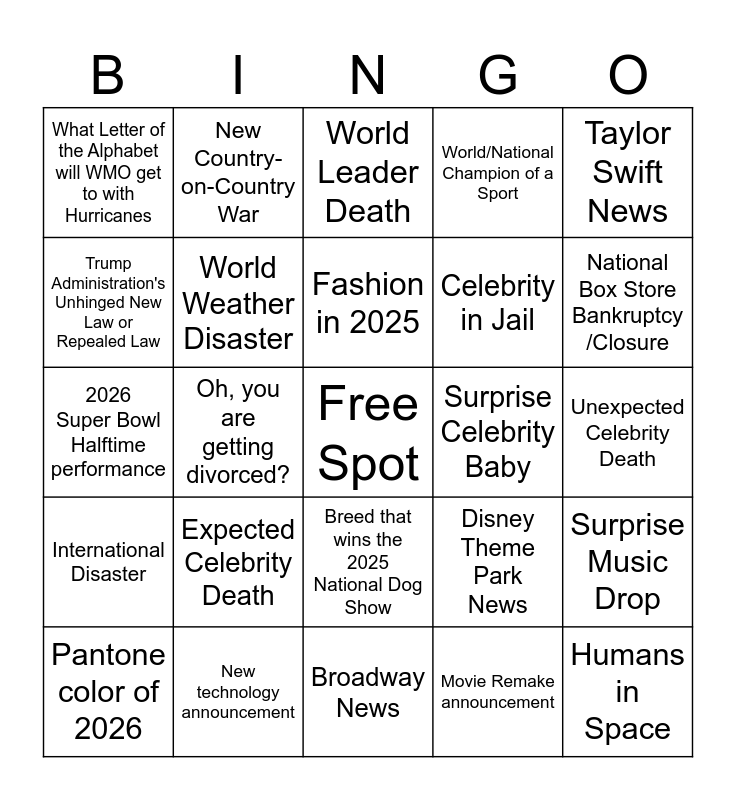 This bingo card has a free space and 24 words: Expected Celebrity Death, New technology announcement, Fashion in 2025, Pantone color of 2026, Taylor Swift News, What Letter of the Alphabet will WMO get to with Hurricanes, Trump Administration's Unhinged New Law or Repealed Law, New Country-on-Country War, Surprise Celebrity Baby, Breed that wins the 2025 National Dog Show, Celebrity in Jail, 2026 Super Bowl Halftime performance, Disney Theme Park News, Surprise Music Drop, World Weather Disaster, Movie Remake announcement, Unexpected Celebrity Death, World Leader Death, National Box Store Bankruptcy /Closure, Oh, you are getting divorced?, Humans in Space, International Disaster, World/National Champion of a Sport and Broadway News.