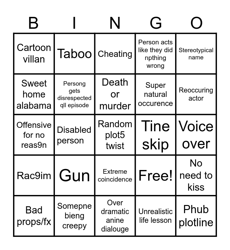 This bingo card has 25 words: Gun, Over dramatic anine dialouge, Death or murder, Bad props/fx, Stereotypical name, Cartoon villan, Sweet home alabama, Taboo, Tine skip, Extreme coincidence, Super natural occurence, Offensive for no reas9n, Free!, No need to kiss, Persong gets disrespected qll episode, Phub plotline, Voice over, Cheating, Reoccuring actor, Disabled person, Random plot5 twist, Somepne bieng creepy, Rac9im, Person acts like they did npthing wrong and Unrealistic life lesson.