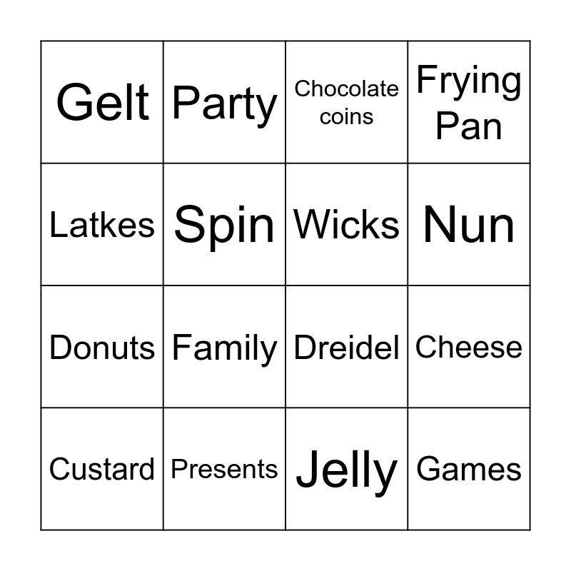 This bingo card has 16 words: Presents, Cheese, Chocolate coins, Gelt, Donuts, Party, Dreidel, Jelly, Latkes, Spin, Custard, Frying Pan, Family, Nun, Wicks and Games.