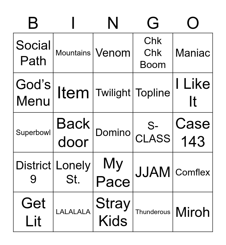 This bingo card has 25 words: District 9, LALALALA, Domino, Thunderous, Maniac, Social Path, Mountains, Venom, S-CLASS, Comflex, God’s Menu, Item, Stray Kids, JJAM, I Like It, Get Lit, Back door, Twilight, Topline, Case 143, Superbowl, Lonely St., My Pace, Chk Chk Boom and Miroh.